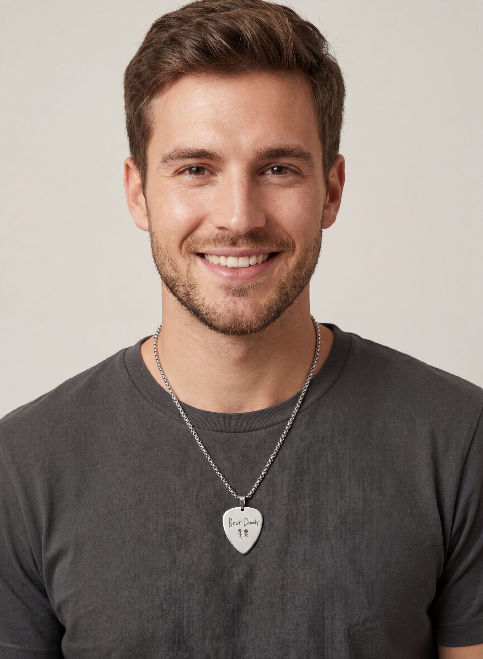 Celebrate the music, the moment, and the connection with this Custom Guitar Pick Pendant. Crafted from durable stainless steel, this guitar-pick shaped pendant can be engraved with your choice of name, initials, date or short message — making it the perfect gift for guitarists, music lovers, or anyone who wants to carry a symbol of their melody close to their heart.